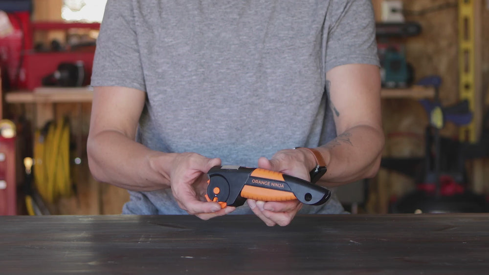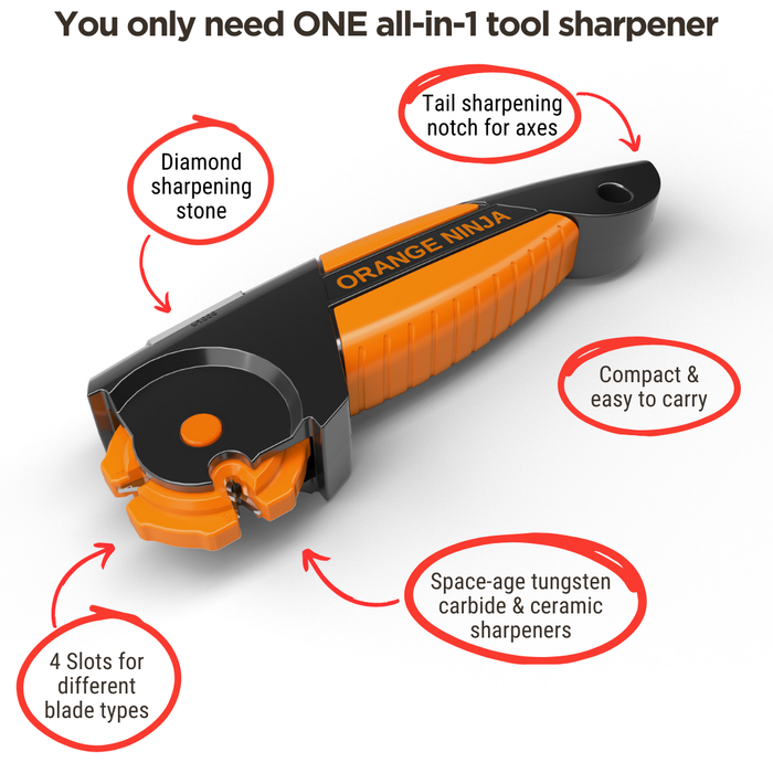 Give your old yard tools a new lease of life with Orange Ninja's All-in-1 Tool Sharpener. Suits axes, shears, pruners, mowers, tomahawks and even EDC knives.